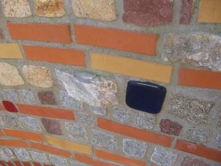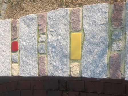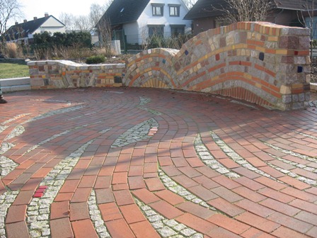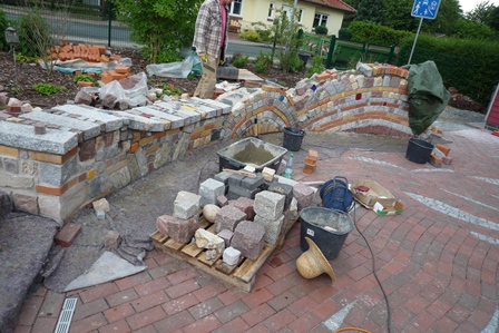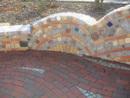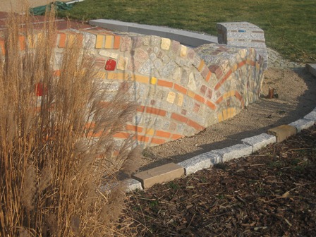 geschwungene Mauer aus Natursteinen und Keramik mit Sitzbereich
