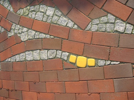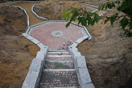 Weg aus Porphyr-Platten und Pflaster, Bepflanzung mit Steingartenstauden